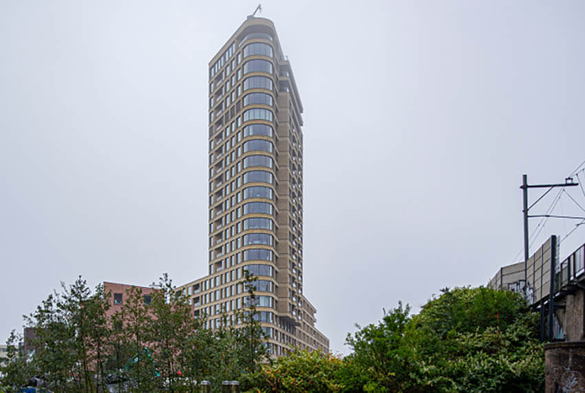 Al eeuwenlang is De Omval de naam van het gebied aan de buitenzijde van de haakse bocht in de Amstel, voordat deze, kaarsrecht gegraven, de stad instroomt. De eerste kantoortoren die hier verscheen begin jaren negentig is de Rembrandt. De inspiratie voor de vormgeving was onmiskenbaar het Empire State Building, New York, maar de schaal is slechts 1/3 daarvan. Alle vier de zijden zijn gelijk. De etages dichtbij de top hebben verkleinende blokvormen en er staat een spits op. Maar de luxe Art Deco afwerking van het origineel is niet gekopieerd. ZZDP-architecten verzorgde het ontwerp.